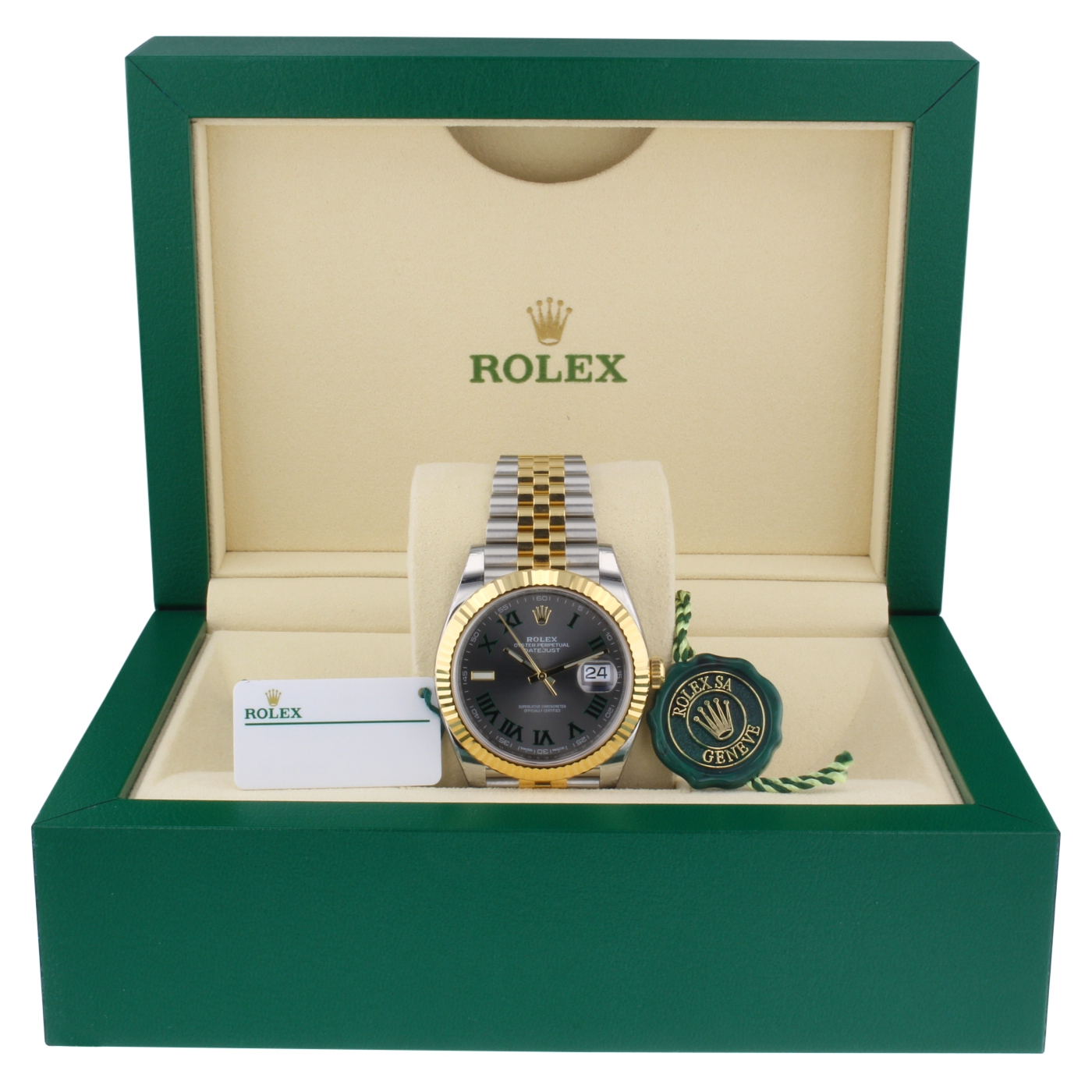 41mm Yellow Rolesor case with 904L steel monobloc middle case, screw-down steel back, 18K yellow gold screw-down crown, 18K yellow gold fluted bezel, scratch-resistant double anti-reflective sapphire crystal with cyclops lens over the date, champagne dial, index hour markers, Rolex caliber 3235 perpetual self-winding movement with date at 3 o'clock that changes instantaneously at midnight in a few thousandths of a second, approximately 70 hours of power reserve, yellow Rolesor Jubilee bracelet made from a combination of 904L steel and 18K yellow gold with five-piece links, folding Oysterclasp buckle with Easylink 5mm comfort extension link. Waterproof to 100 meters.